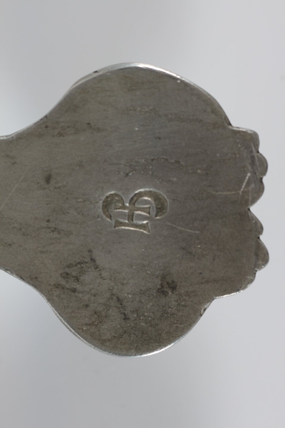 Mogens Ballin (1871-1914) Håndspejl af tin i skønvirkestil med håndtag udformet som trane Sign. monogram for Hertz Ballin Længde 33,5 cm Bredde 18 cm Producent: Hertz og Ballin Fin brugt stand - Spejlglas med let patina