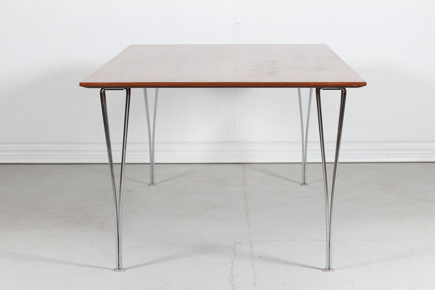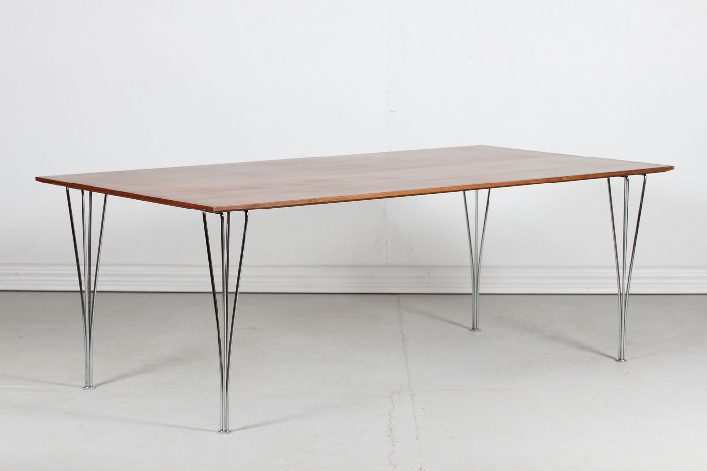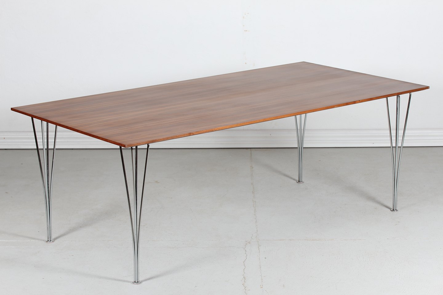 Piet Hein (1905-1996) + Bruno Mathsson Large working table made of walnut veneer with chromium-plated legs from 1969 Manufacturer: Fritz Hansen A/S Length 200 cm Width 100 cm Height 70 cm Nice vintage condition
