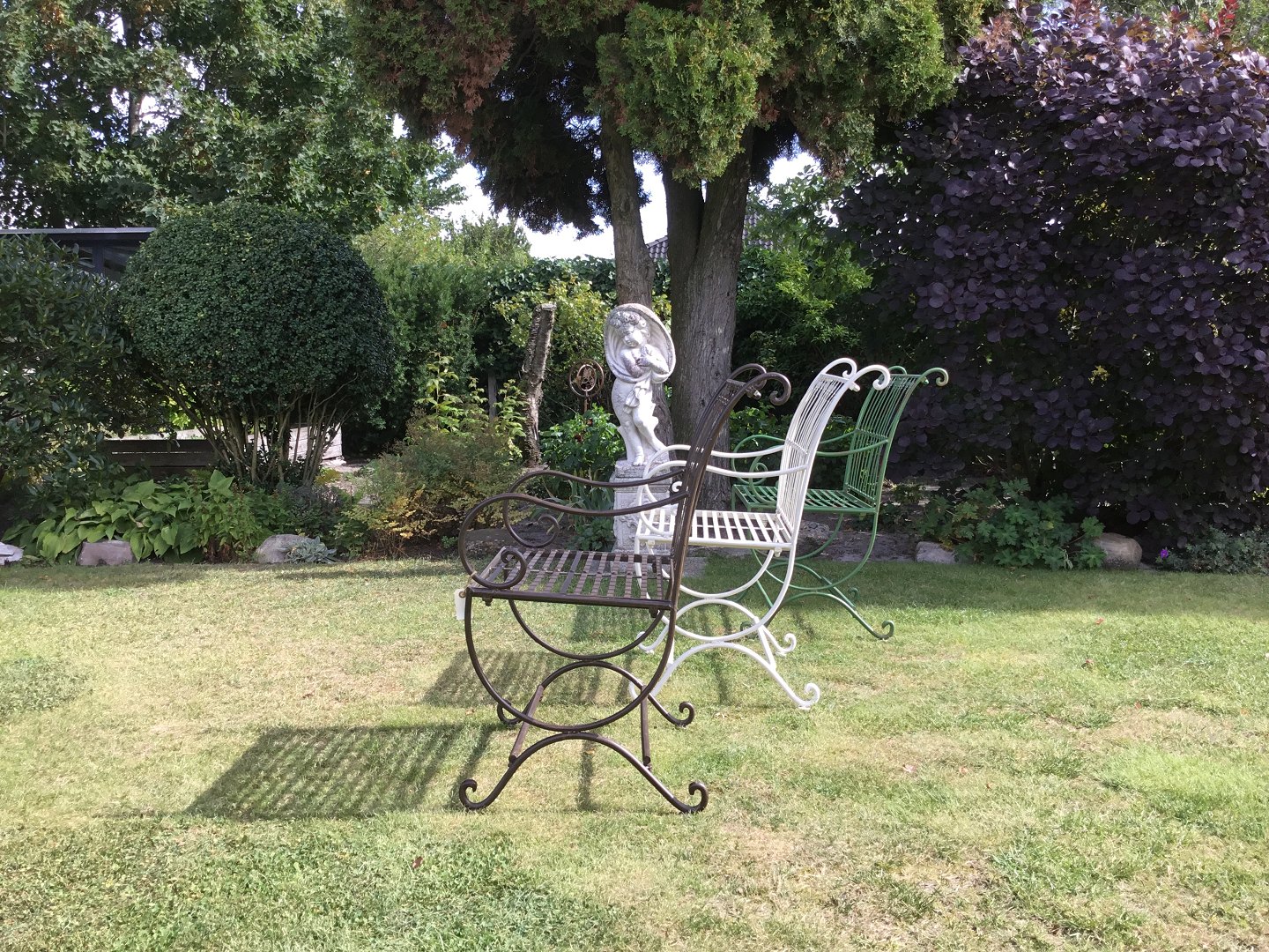 Havestol af smedejern Havestol med armlæn fremstillet af håndsmedet og hvidpatineret jern i god kraftig kvalitet Længde 53 cm Dybde 63 cm Højde 86 cm Sæde højde 44 cm Stolen kan beses efter aftale i vores butik