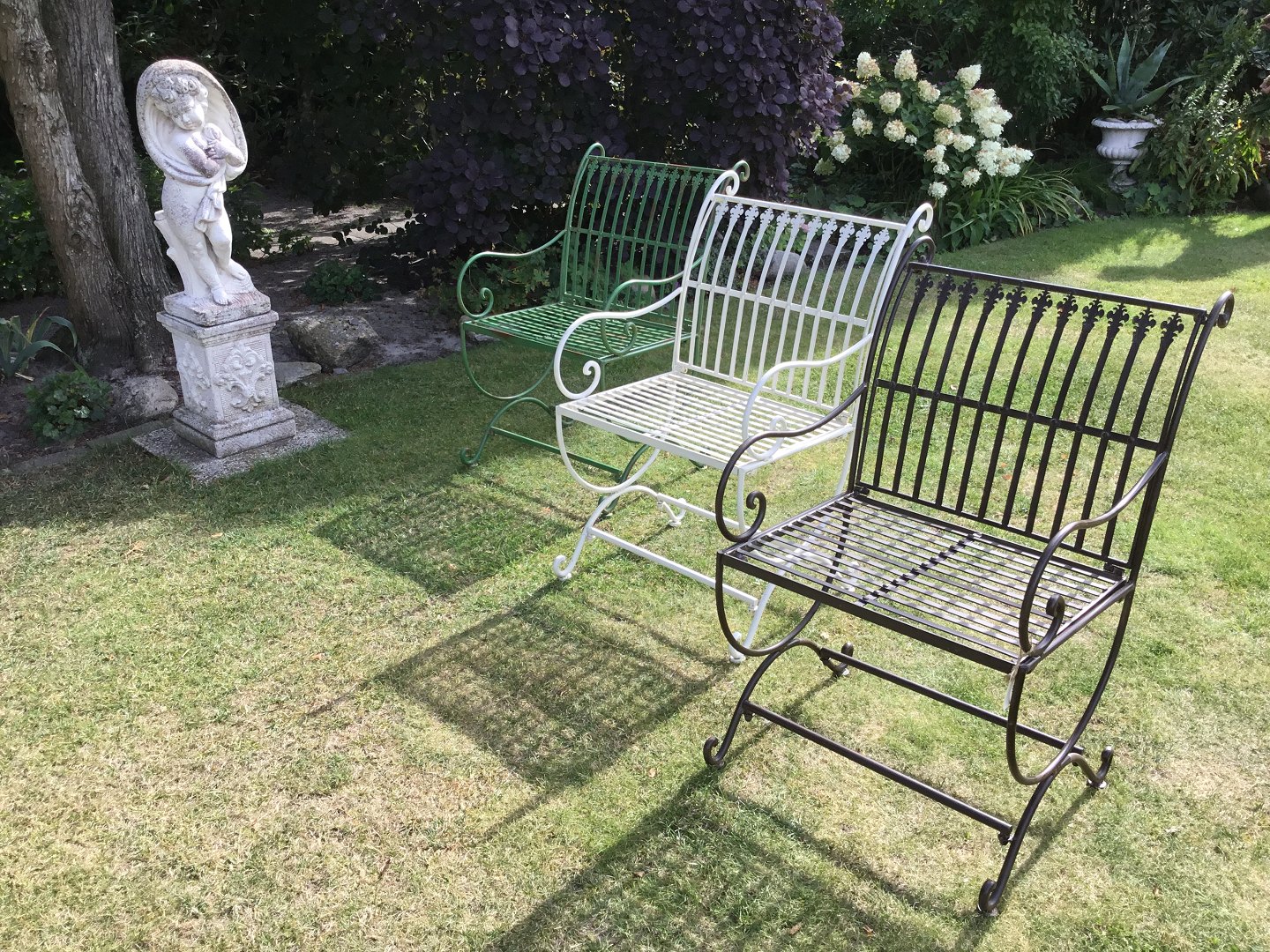 Wrought iron garden chair Garden chair made of handmade wrought iron, green patina painted Length 53 cm Depth 63 cm Height 86 cm Seat height 44 cm New condition with vintage look