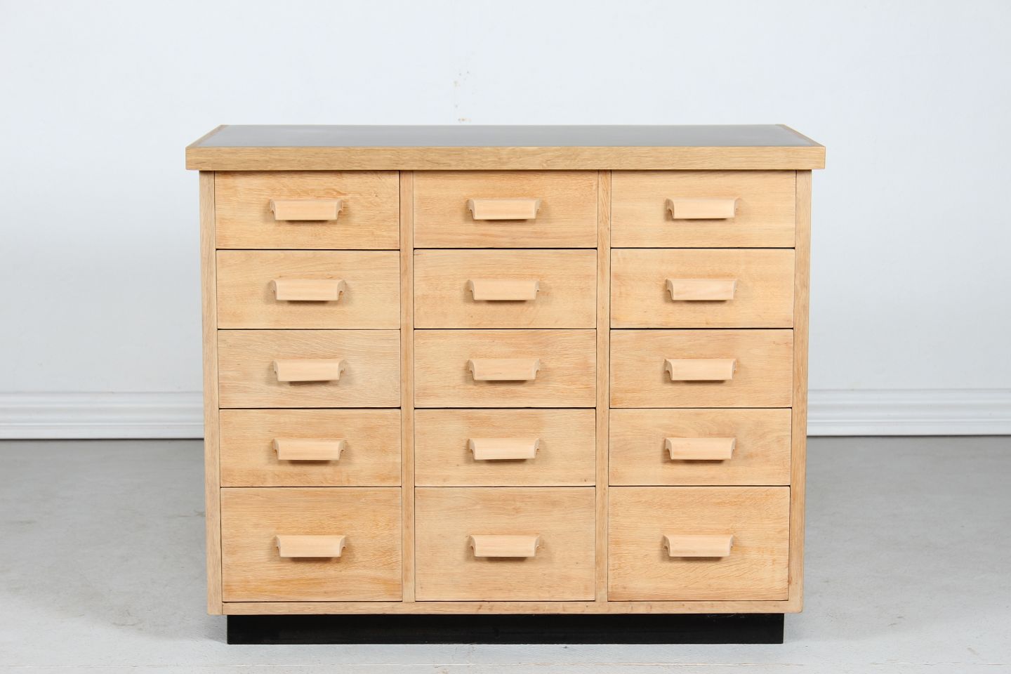 Gl. disk med 15 skuffer fremstillet af eg, massiv og finer.