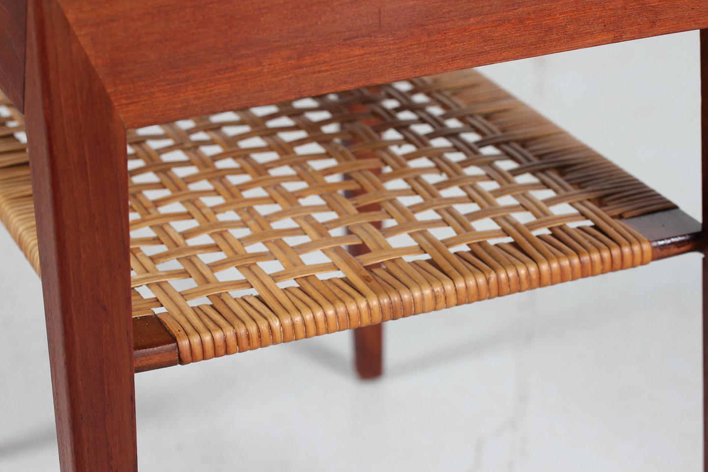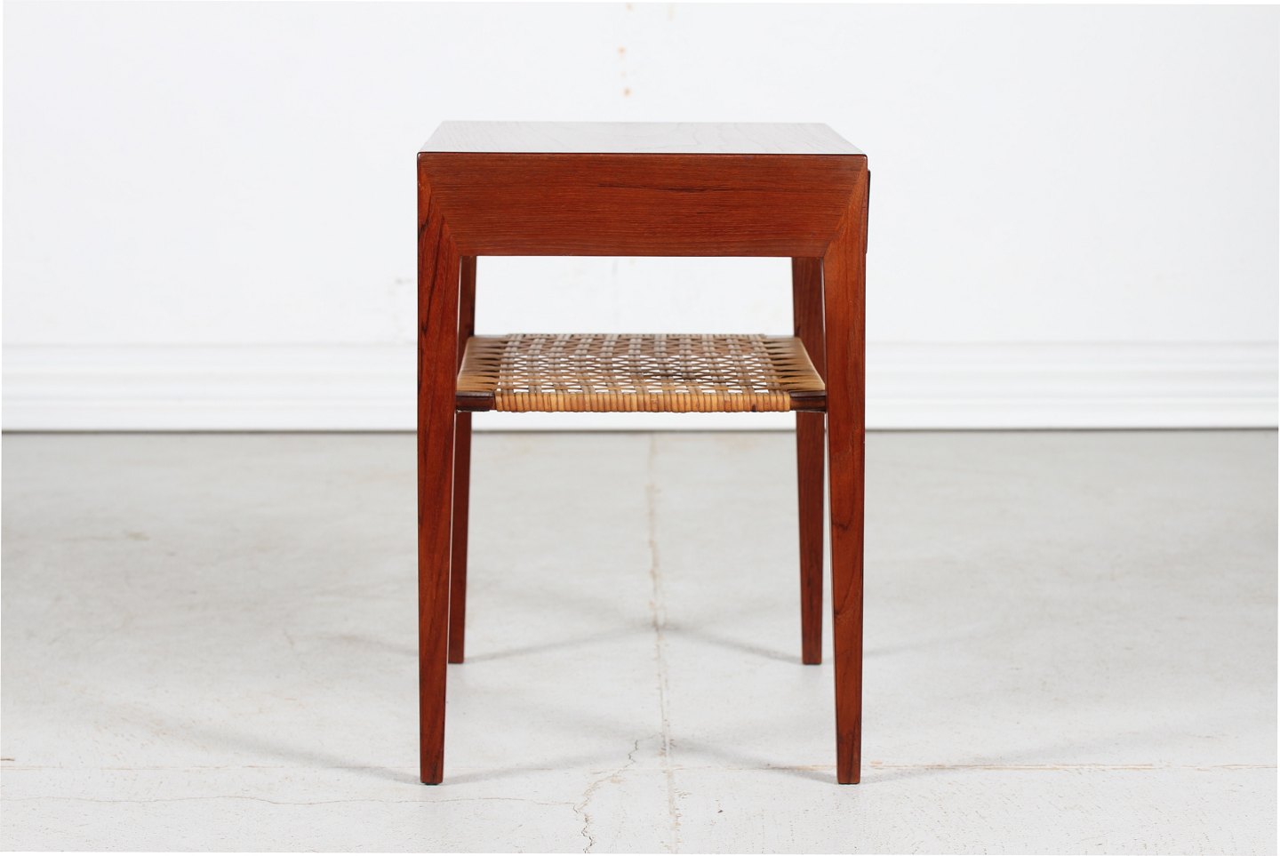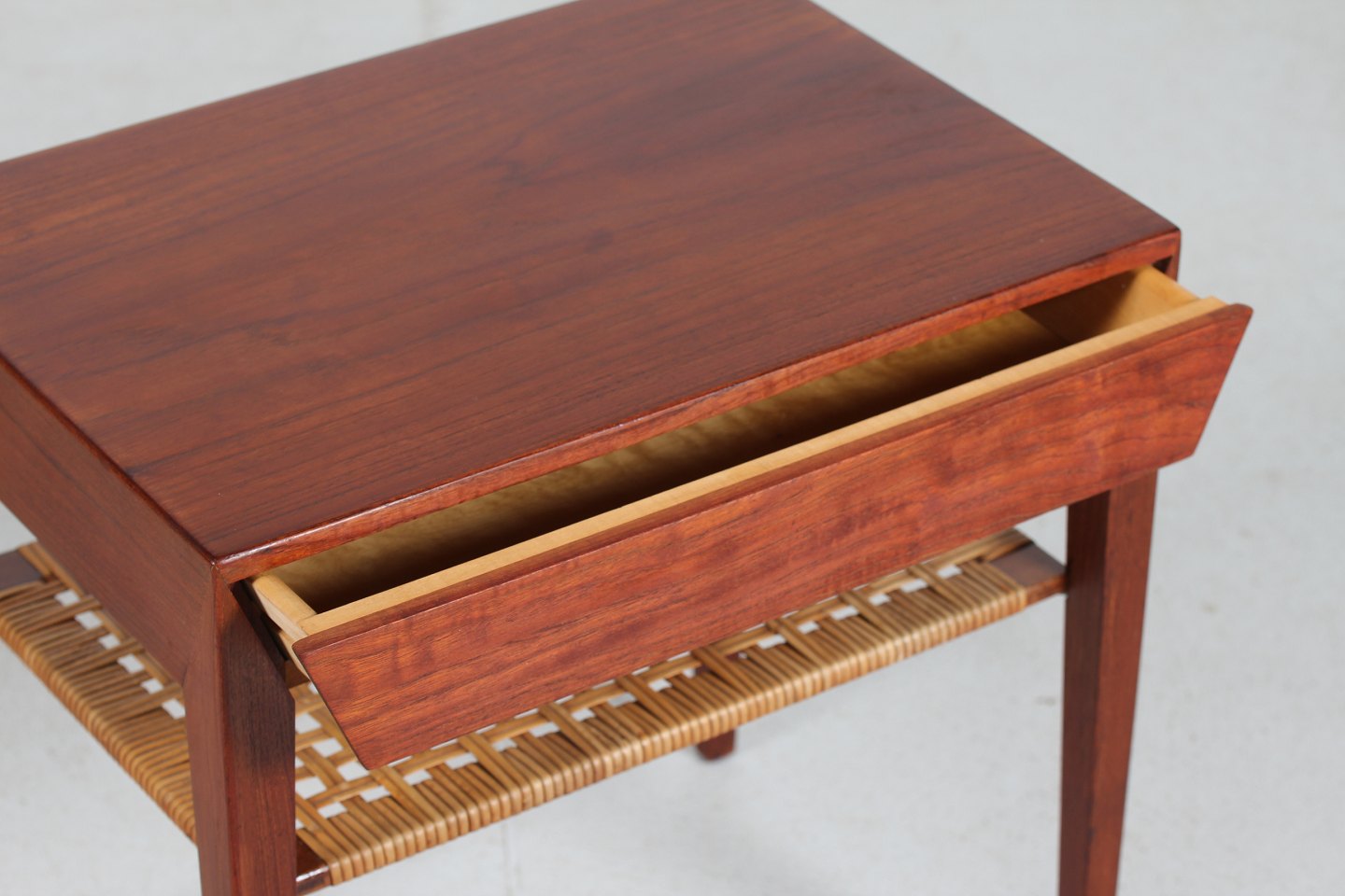 Severin Hansen Jr. Lampe- og sidebord af teak på tilspidsede ben med skuffe og flettet magasinhylde Producent: Haslev Møbler Længde 58 cm Bredde 35 cm Højde 50 cm Fin stand Bordet kan beses efter aftale
