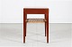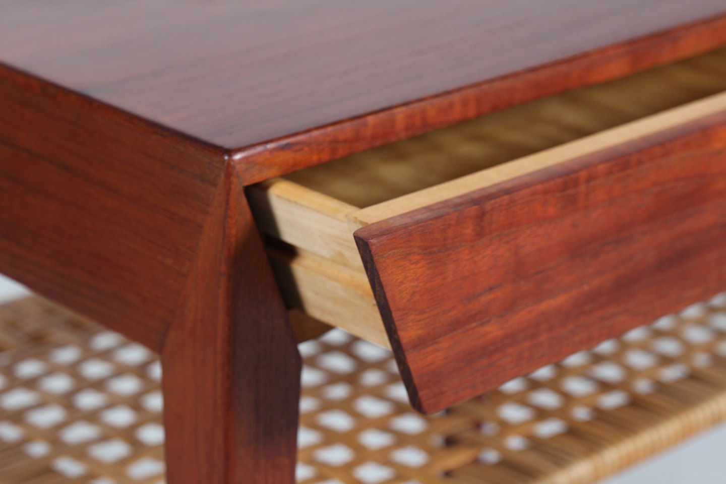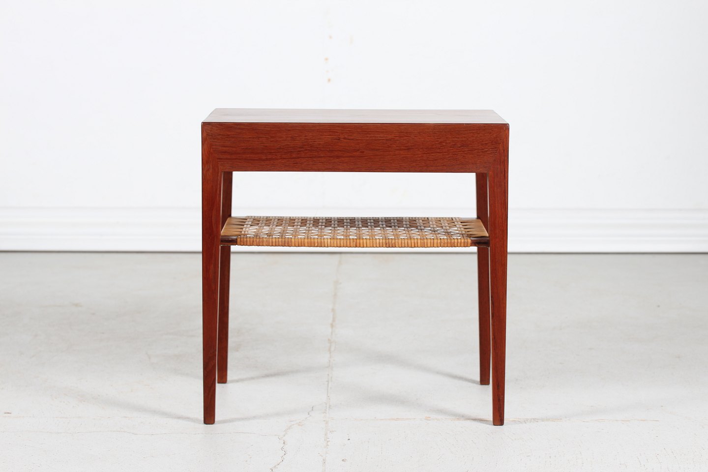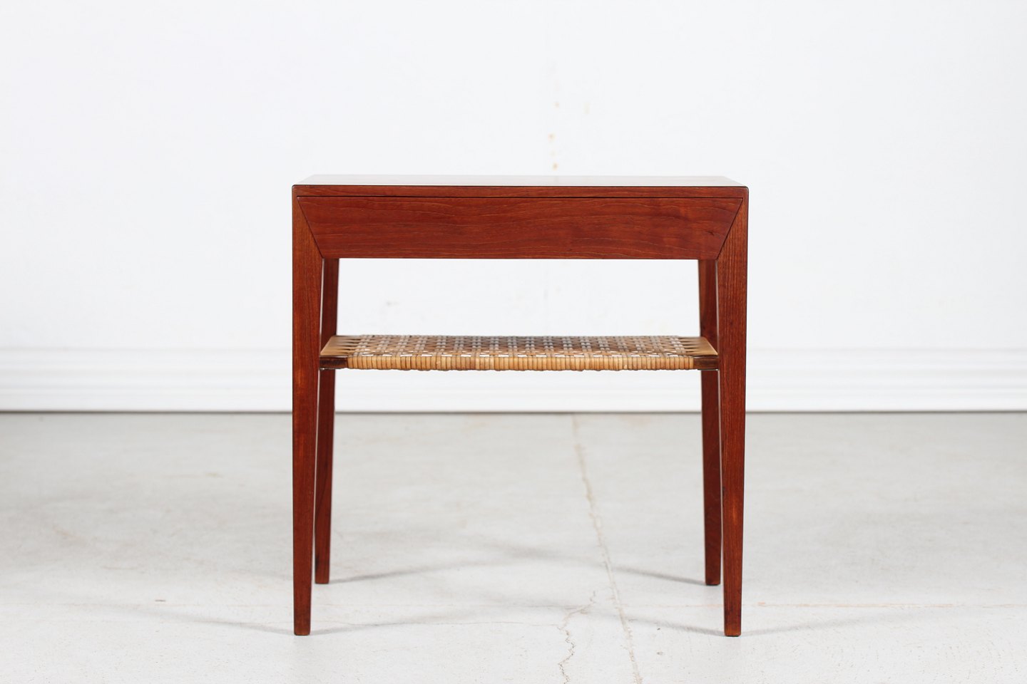 Severin Hansen Jr. Lampe- og sidebord af teak på tilspidsede ben med skuffe og flettet magasinhylde Producent: Haslev Møbler Længde 58 cm Bredde 35 cm Højde 50 cm Fin stand Bordet kan beses efter aftale