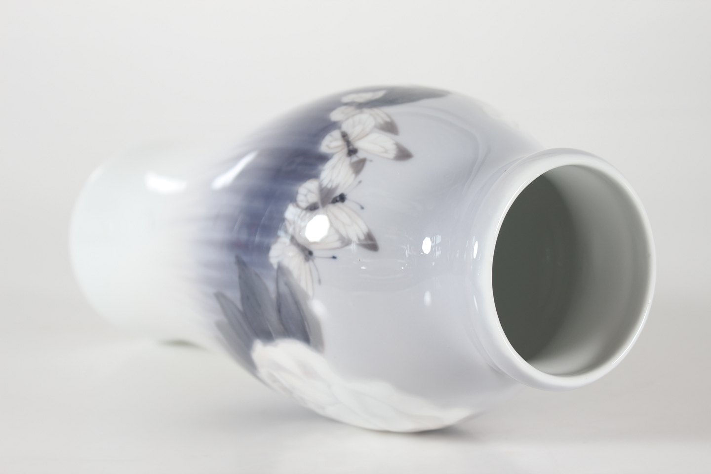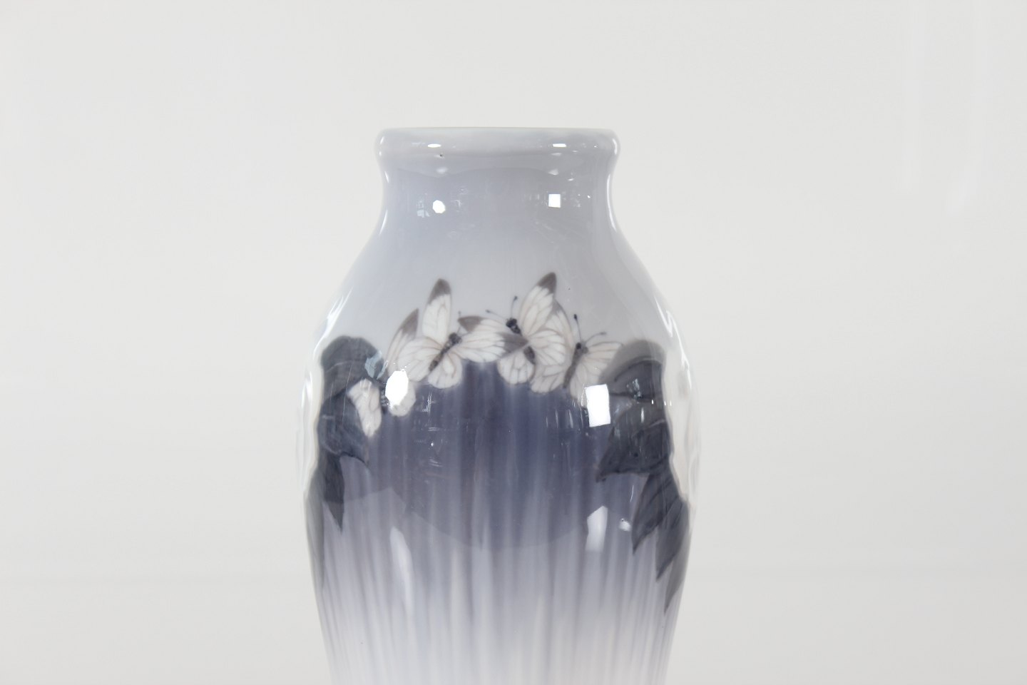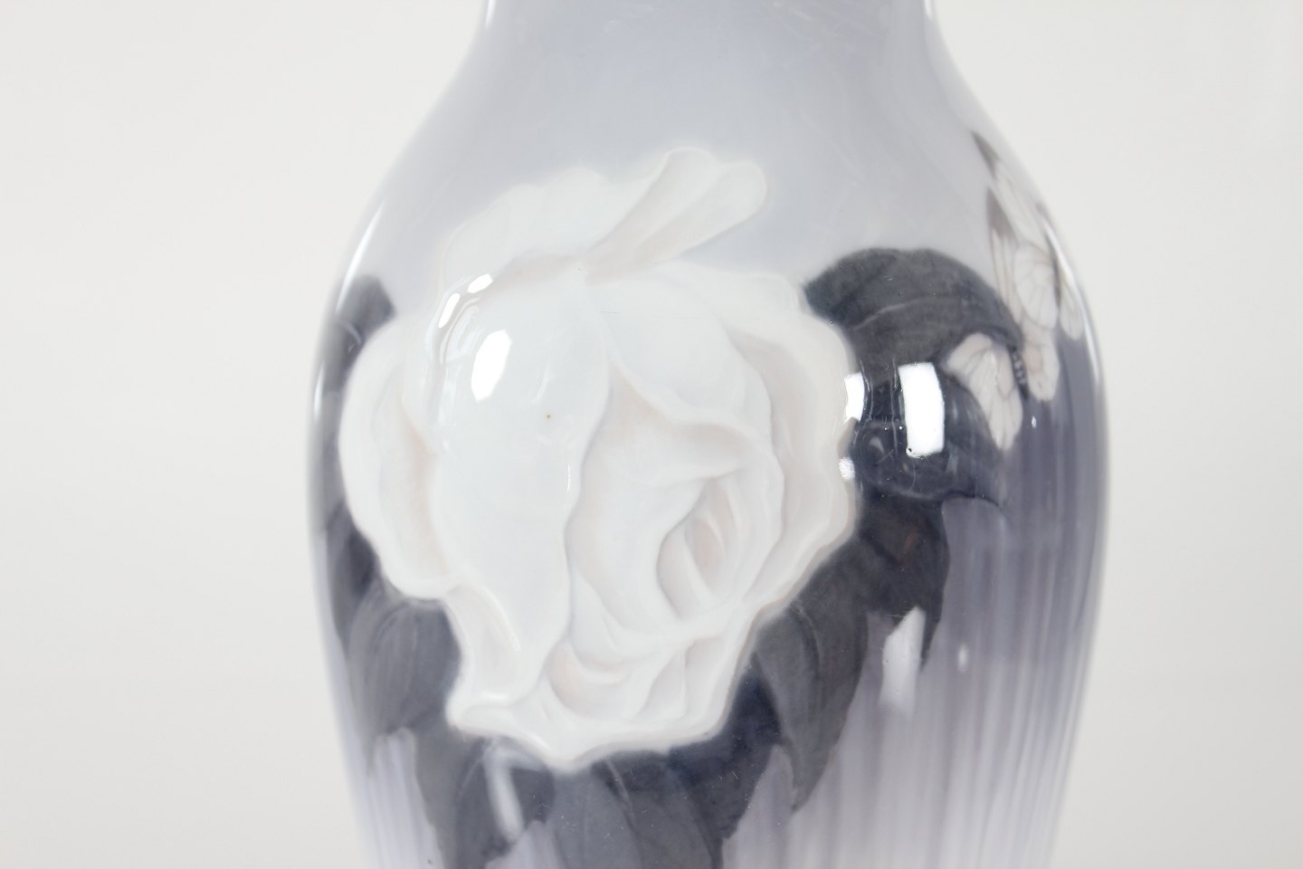 Royal Copenhagen Tall slim antique vase with roses and butterflies Item no. 1942/244 Made in the period 1894-1923 Height 32 cm Diameter 14 cm Very fine condition, factory 1 - no chips, cracks or repair