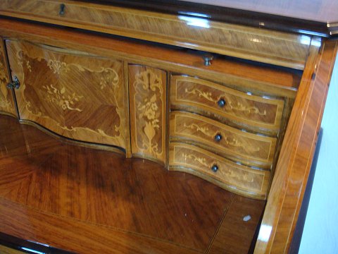 Cylinderformet klap bag 6 skuffer , 2 hemmelige skuffer , 1 låge med støre rum bag ved, og udtrækkelig skriveplade.