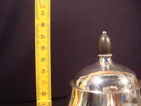 Kaffekande Sukker og flødekande af let hammerslået sterlingsølv 925s , glat buttet korpus, stjerthanke og lågknopper af sort træ. Dessin 80 A. Efter 1945