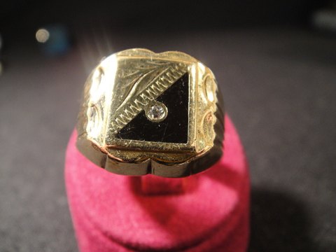 Ring med onyx og zirkon. Guld 14k 585 Ringstørelse 63 SOLGT