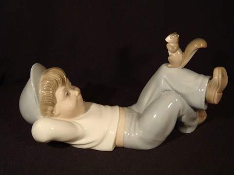 Figur. Dreng ligger på ryggen og ser på egern. Spansk figur Zaphin. Flot og pæn stand.