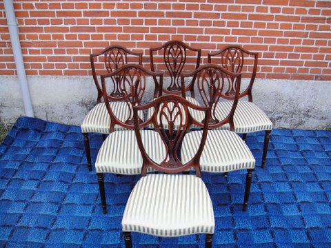 Hepplewhite Stühle 6 Stück Mahagoni, Schild-förmigen Rücken mit Schnitten am verjüngten vorderen Beine.