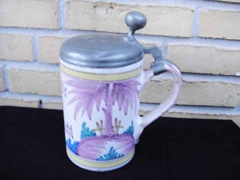 Kellinghusen mug with tin lid. (copy) However, this made at another German factory in 1800. Height 22 cm. Diameter: 11 cm.I city Kellinghusen there was a faience from the year 1764 to 1860som was very famous for its earthenware Talerkner, mugs, dishes mm.Her is a lovely mug but with hairline crack in view photos. from another German factory which mimicked Kellinghusen. but in good condition.