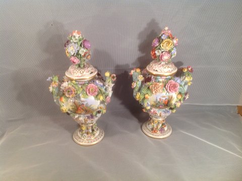 1 stk. Pryd Vaser af porcelæn og hanke. Dekoreret med guld, små kærlighedsmotiver, og pousserede blomster. Potschappel, Tyskland, 19./20. århundrede. Højde: 27 cm. Fremstår med afslag i blomster.
