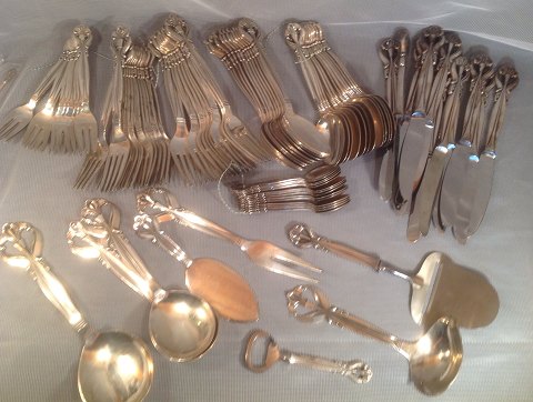 12 stk. Middagsknive. 12 stk. Middagsgaffel. 12. stk spiseske. 12 stk. Dessertske. 12 stk. Kagegaffel. 12 stk. kaffeske. 1stk. Stegegaffel. 12 stk. Frokostgaffel. 1 stk Sovseske. 1 stk. Ostehøvl. 1 stk. kompotske. 1 stk. kartoffelske. 1 stk. Oplukker.