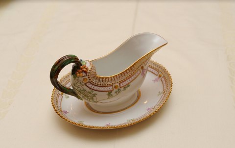 Flora Danica. Prinsesse Dagmars middagsservice af porcelæn dekoreret i farver og guld, bestående af: 12 middagstallerkener med forskellige blomster bl.a. 'Galeopsis Laudanum.L.' og 'Heleosciadium repens. Koch.', no. 3549, Ø ca. 25,3 cm, tre med hver et lille skår, 12 frokosttallerkener med forskellige blomster bl.a. 'Pulsatilla vulgaris Lob.' og 'Lathyrus silvestris. L.', no. 3550, Ø ca. 22,2 cm, seks med små skår samt en med hårrevne, stort ovalt fad med 'Trollius europæus.L.', no. 3519, L. 45 cm, stort ovalt fad med 'Carduus nutans.L.', no. 3519, L. 44,8 cm, kant med lille skår, 11 asietter med bl.a. 'Polygala depressum. L.' og ' Cerastium tetrandrum. Curtis.', no. 3552, Ø 14,2 cm, fem med små skår, oval skål med 'Lysimachia vulgaris. L.', no. 3506, L. 24,5 cm, lille tresidet skål med hank med 'Lonicera floribunda. L.', no. 3544, L. 21 cm, med to små skår og repareret hank, to ovale saucekander på underfade med grenhanke og pousserede blomster med bl.a. 'Fumaris micrantha. Lag.', no. 3556, L. ca. 24 cm, lille tresidet skål med låg og underfad med grenhank og pousserede blomster 'Viola tricolor L. d. arenaria. Sond.', no. 3575, H. 9 cm, stort ovalt lågfad med grenhanke og poussere blomster med 'Lavatera thuringiaca. L.', no. 3567, H. 18 L. 40 cm. Proveniens: Gave fra danske kvinder til prinsesse Dagmars (1890-1961) bryllup med Hofjægermester Jørgen Castenskiold (1893-1978) den 22.1.1922. Prinsesse Dagmar var datter af kong Frederik VIII (1843-1912) og dronning Lovisa (1851-1926) og var opkaldt efter sin faster og gudmor, kejserinde Dagmar (Marie Feodorowna) (1847-1928) af Rusland. Afbildet: Artikel om Herregården 'Kongstedlund' med interieurfotografier med prinsesse Dagmar og Jørgen Castenskiold, Dansk Familieblad 17. april 1962.