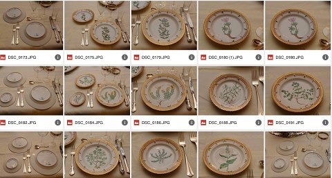 Flora Danica. Prinsesse Dagmars middagsservice af porcelæn dekoreret i farver og guld, bestående af: 12 middagstallerkener med forskellige blomster bl.a. 'Galeopsis Laudanum.L.' og 'Heleosciadium repens. Koch.', no. 3549, Ø ca. 25,3 cm, tre med hver et lille skår, 12 frokosttallerkener med forskellige blomster bl.a. 'Pulsatilla vulgaris Lob.' og 'Lathyrus silvestris. L.', no. 3550, Ø ca. 22,2 cm, seks med små skår samt en med hårrevne, stort ovalt fad med 'Trollius europæus.L.', no. 3519, L. 45 cm, stort ovalt fad med 'Carduus nutans.L.', no. 3519, L. 44,8 cm, kant med lille skår, 11 asietter med bl.a. 'Polygala depressum. L.' og ' Cerastium tetrandrum. Curtis.', no. 3552, Ø 14,2 cm, fem med små skår, oval skål med 'Lysimachia vulgaris. L.', no. 3506, L. 24,5 cm, lille tresidet skål med hank med 'Lonicera floribunda. L.', no. 3544, L. 21 cm, med to små skår og repareret hank, to ovale saucekander på underfade med grenhanke og pousserede blomster med bl.a. 'Fumaris micrantha. Lag.', no. 3556, L. ca. 24 cm, lille tresidet skål med låg og underfad med grenhank og pousserede blomster 'Viola tricolor L. d. arenaria. Sond.', no. 3575, H. 9 cm, stort ovalt lågfad med grenhanke og poussere blomster med 'Lavatera thuringiaca. L.', no. 3567, H. 18 L. 40 cm. Proveniens: Gave fra danske kvinder til prinsesse Dagmars (1890-1961) bryllup med Hofjægermester Jørgen Castenskiold (1893-1978) den 22.1.1922. Prinsesse Dagmar var datter af kong Frederik VIII (1843-1912) og dronning Lovisa (1851-1926) og var opkaldt efter sin faster og gudmor, kejserinde Dagmar (Marie Feodorowna) (1847-1928) af Rusland. Afbildet: Artikel om Herregården 'Kongstedlund' med interieurfotografier med prinsesse Dagmar og Jørgen Castenskiold, Dansk Familieblad 17. april 1962.