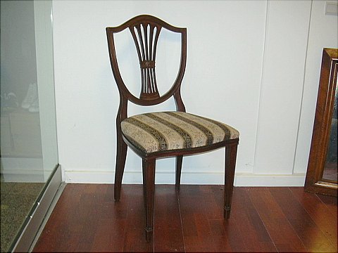 Hepple-White spisestue af mahogni. Bestående af bord L:168 cm. B:115 cm.H:76 cm., 8 stole heraf 2 med armlæn, skænk L:220 cm. D: 44,5 cm. H: 86 cm., glas vitrine L:144 cm. D: 45 cm. H: 184 cm., samt 2 plader L:50 cm. B.115 cm.