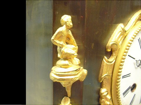 Fransk kaminur af Lueforgyldt og patineret bronze, på urhus kvinde med kastagnetter og fløjtespillende mand, på urets sider kat og abe med musikinstrumenter, Skive af hvid emalje med små afslag og hårrevner. Værk stemplet Japy Freres Medaille D'Or og E et Cie. anno 1800 tallet begyndelse