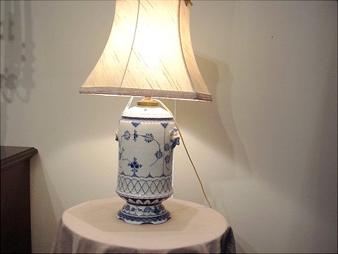Kongelig musselmalet riflet - stor petroleumslampe omlavet til el.