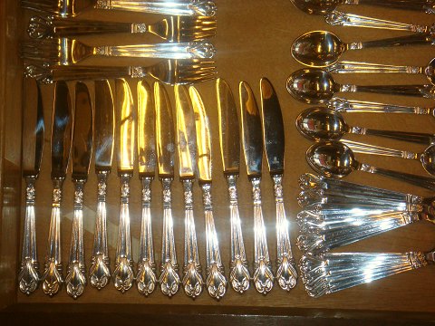 12 middags knive, 12 middags gaffel, 12 Suppeskke, 12 Decertske, 12 kaffeske, 1 sovseske ,1 kompotske, 1 sovseske, 1 kompotske