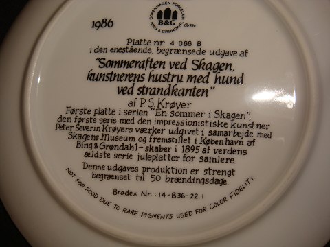First plate in the series, a summer evening at Skagen, the first series with impresionisiske artist peter Serverin Krøyers works. published in cooperation with the Skagen Museum, and produced in Copenhagen by Bing & Grondahl. Creating in 1895 the world's oldest series of Christmas plates for collectors.