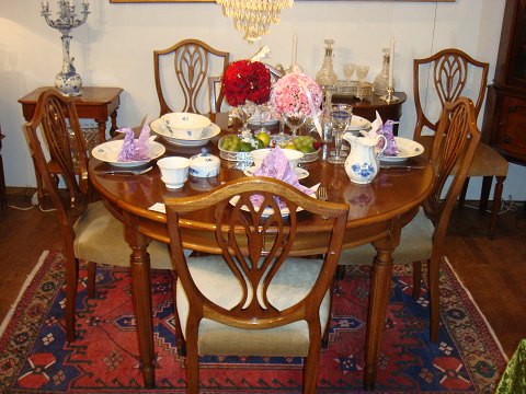 Hepplewhite dining table + 6 chairs and 2 plates SOLD from Farre Furniture (Sideboard sold)