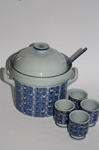 Aluminia, Tenera serien. Design: Grete Helland-Hansen. Punchbowle med låg og ske. De 2 krus er solgt kun 1 der er limet i foden se ekstra foto. Højde med låg 24 cm. Diameter uden ører 22 cm. Krus nr. 471/3292. Låg nr 448/3271. Fin stand. Samlet pris: 750 kr.
