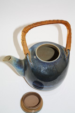 Michael Andersen, Bornholm. Høj tekande med flethank i blålige glasurer. højde uden hank 19 cm.