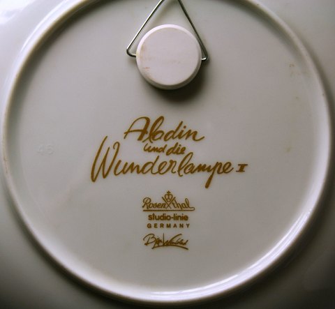 Rosenthal/Studio-Line, samler serie af Bjørn Wiinblad med 12 motiver fra eventyret om Aladin og den vidunderlige lampe. Motiv nr 1: Aladin og den vidunderlige lampe. Udgivet i 1979 i forbindelse med 100 års jubilæum for Rosentahl. Platterne er koboltblå med forgyldte kanter og motiver. Diameter 16 cm. Pris med originalæske: SOLGT