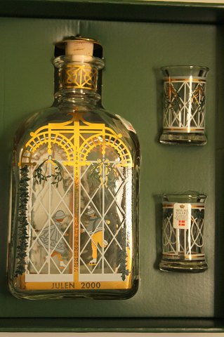 Juleflaske med 2 dramglas og originalæske årgang 2000 Holmegaard