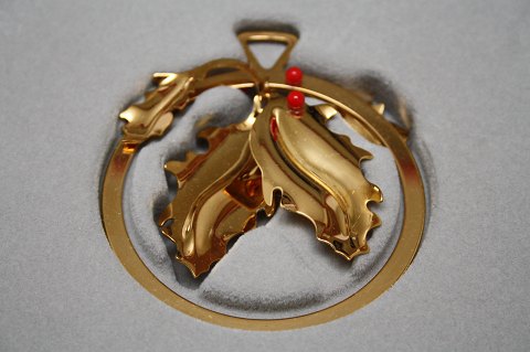 Georg Jensen, Juleuro 1988 Kristtjørn designet af Lene Munthe uddannet designer på Kunstakademiets Arkitektskole. Juleuroen er udført i messing belagt med 24 karat guld. Originalt rødt silkebånd og gaveæske medfølger. Pæn stand. Med 3 kugler, mangler 1 på bagside. Pris: SOLGT