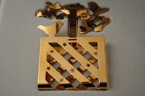 Georg Jensen, Juleuro 1990 Julekurven designet af kunstner Anne Marie Trolle. Juleuroen er udført i messing belagt med 24 karat guld. Originalt rødt silkebånd og gaveæske medfølger. Pæn og velholdt stand. Pris: SOLGT