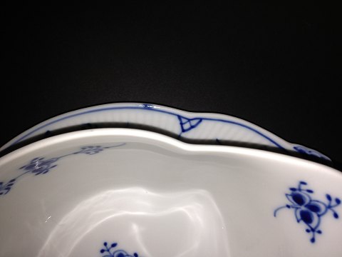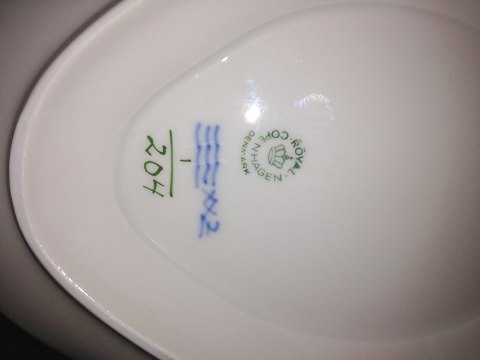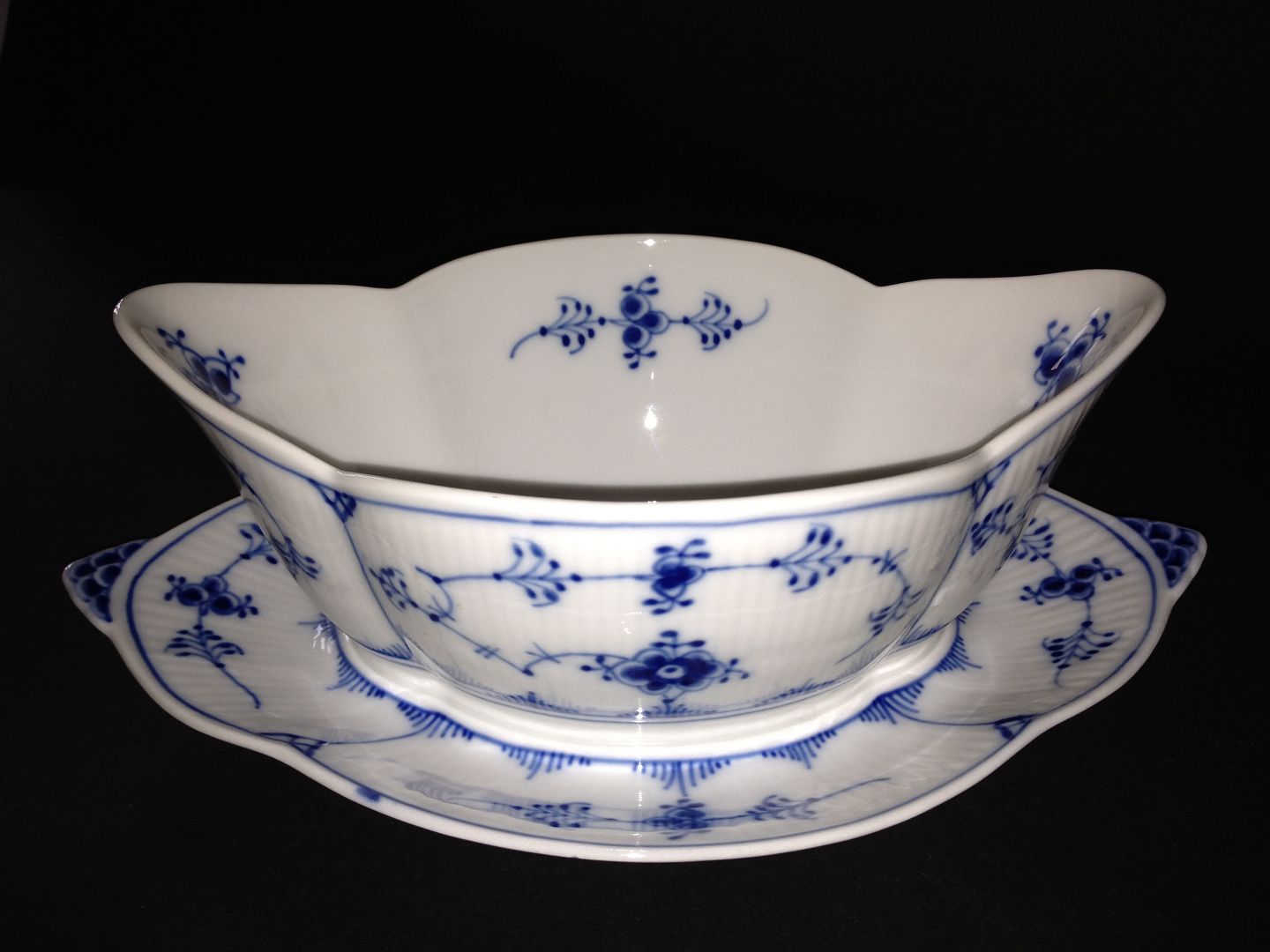Royal Copenhagen, Musselmalet riflet sovseskål, musselmalet dek. nr. 1/201. Længde 23,5 cm. Højde 9 cm.