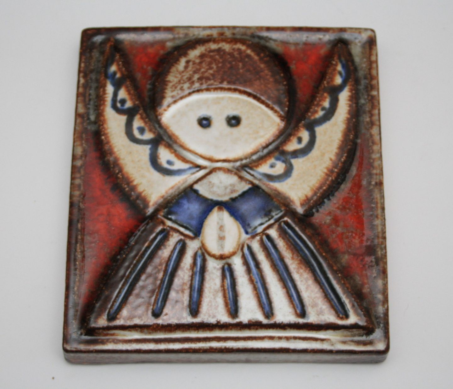 Søholm, Bornholm, relief med engel i brun/blå glasur på rødglaseret baggrund. Dek.nr. 3572. 15,5 x 15,5 cm. Pris: 250 kr.