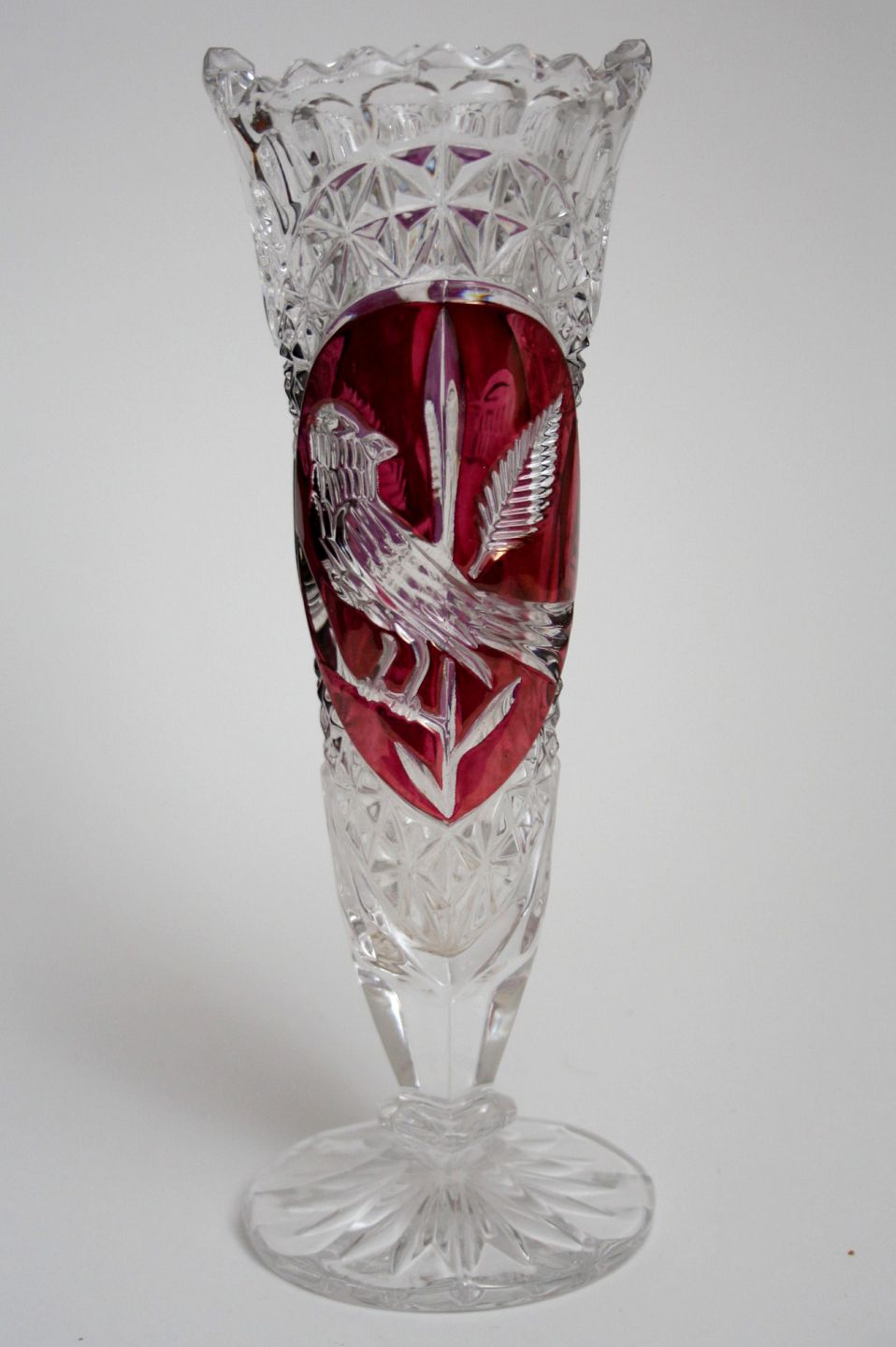 Bøhmisk krystal vase med fuglemotiv. Højde 22 cm. Diameter top 7 cm. Diameter bund 8 cm. Pris: SOLGT