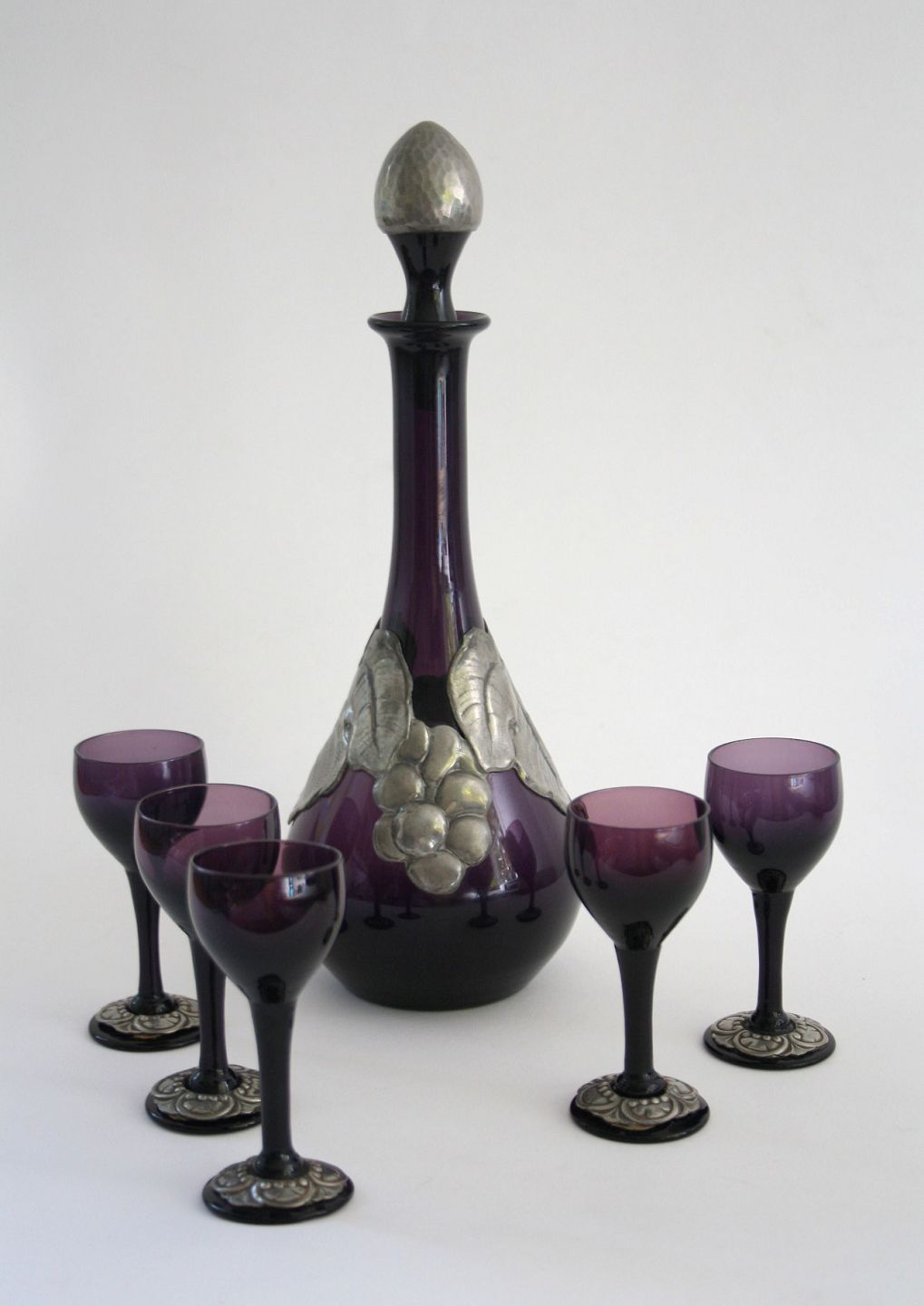 Violet karaffel, højde 28 cm. og 5 glas, højde 9,3 cm. med tin ornamenter. Pris samlet 900 kr. Hel og fin stand. SOLGT