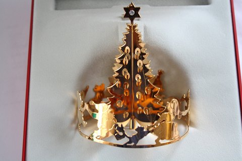 Georg Jensen, juleuro 1997, Juleglæde designet af kunstner Finn Næss-Schmidt. Juleuroen er udført i messing belagt med 24 karat guld. Originalt rødt silkebånd og gaveæske medfølger. Pæn og velholdt stand. Pris: SOLGT