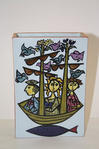 Holmegaard, Atlantis serien designet af Michael Bang i 1980. Farveklatter og tråde i blåt glas på opal hvidt og klart glas. Blæst i tre lag glas. Vase højde 10,5 cm. Diameter 9,5 cm. Pris: SOLGT