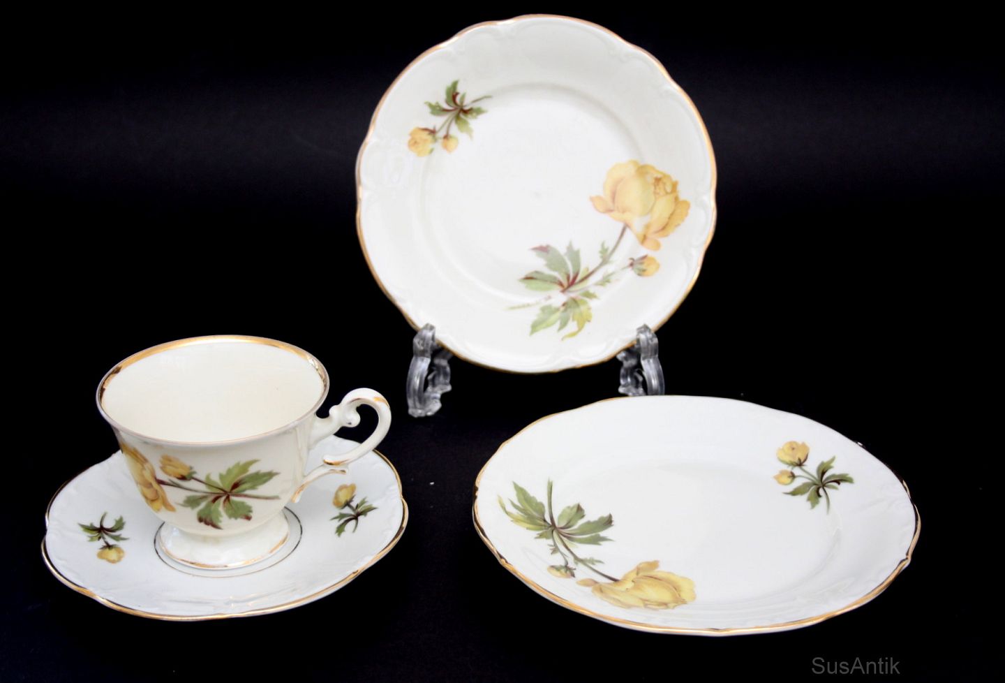 Bavaria, Tirschenreuth, Engblomme, dekoreret på Antoinette eller Marie Antoinette cremefarvet stel med gule blomster og guldkanter. Importeret af Norden og senere Bucka og Nissen. Stellet er dekoreret i Danmark.