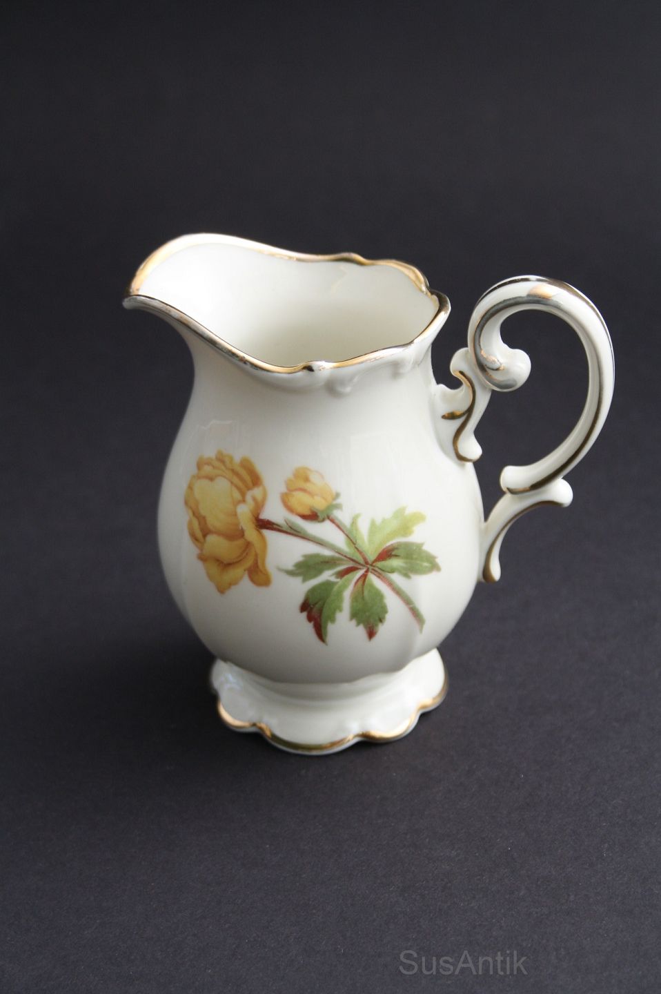 Bavaria, Tirschenreuth, Engblomme, dekoreret på Antoinette eller Marie Antoinette cremefarvet stel med gule blomster og guldkanter. Importeret af Norden og senere Bucka og Nissen. Stellet er dekoreret i Danmark. Flødekande. Højde 11 cm. SOLGT