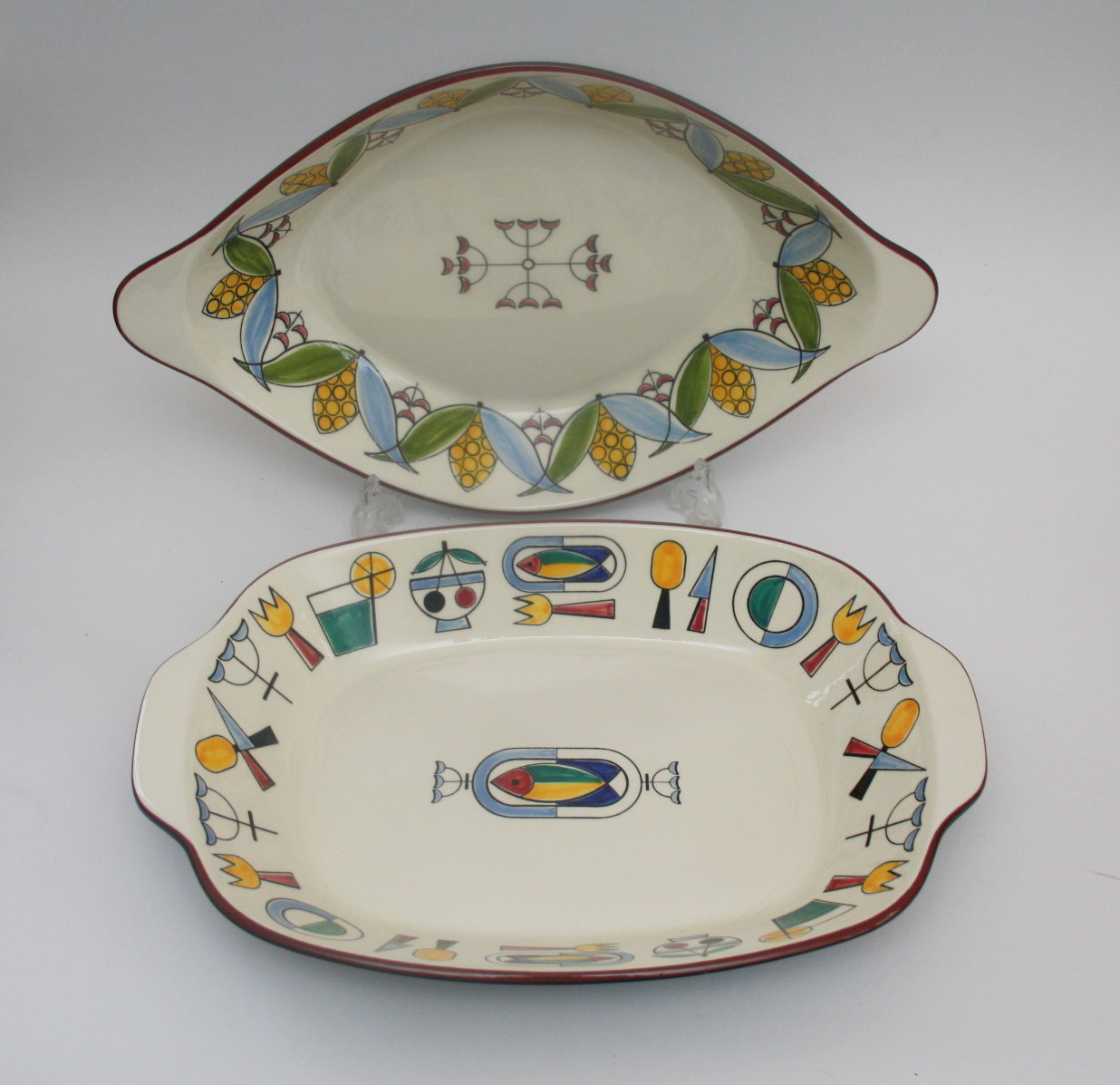Stående fad bagerst. Lettere krakeleret. 36x23 cm. Højde 5 cm. afslag bagpå se ekstra foto, samt lille kantafslag. Pris: SOLGT
