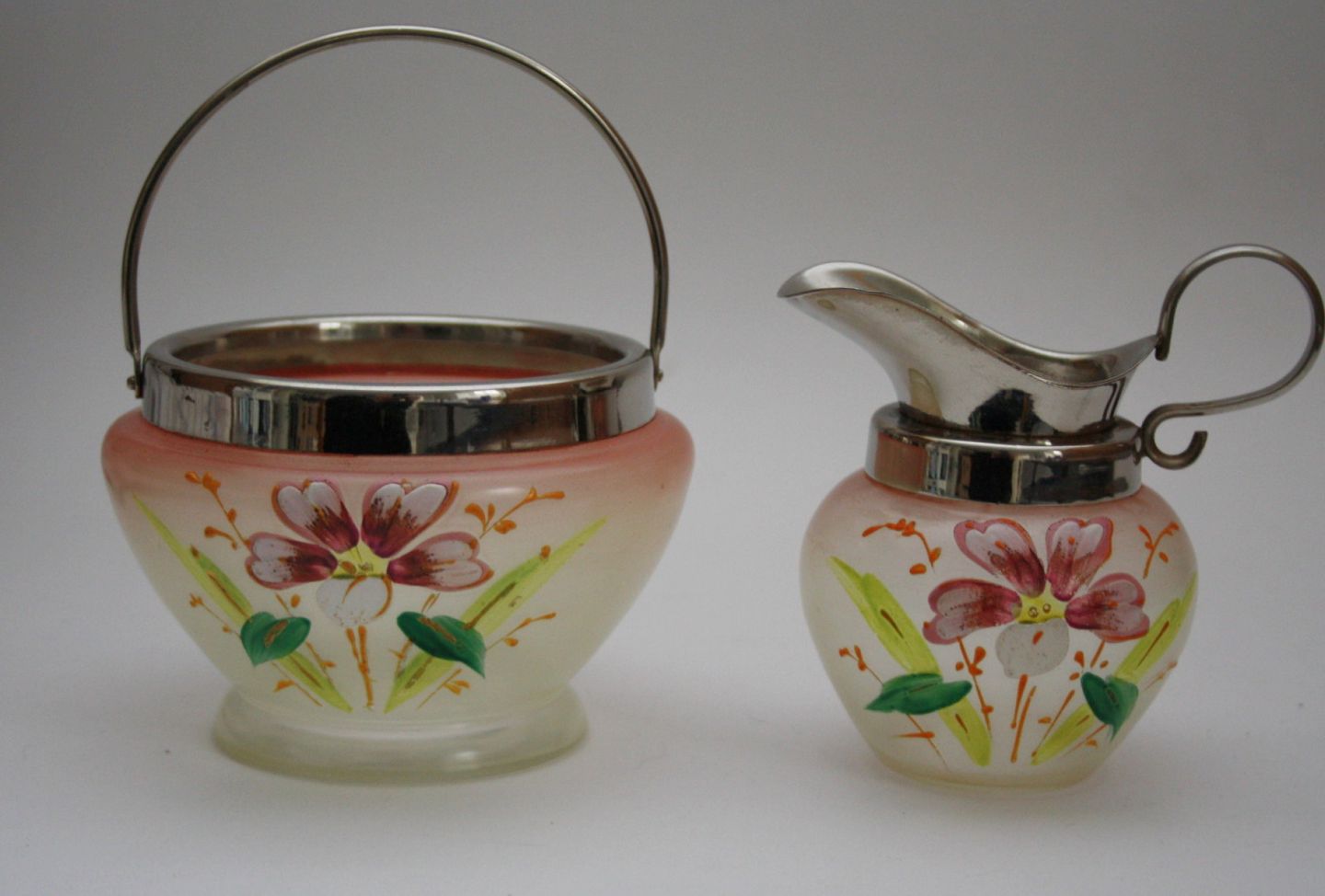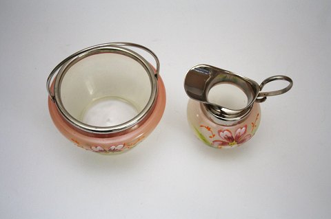 Sukker og flødesæt i bemalet glas med blankmetal håndtag.