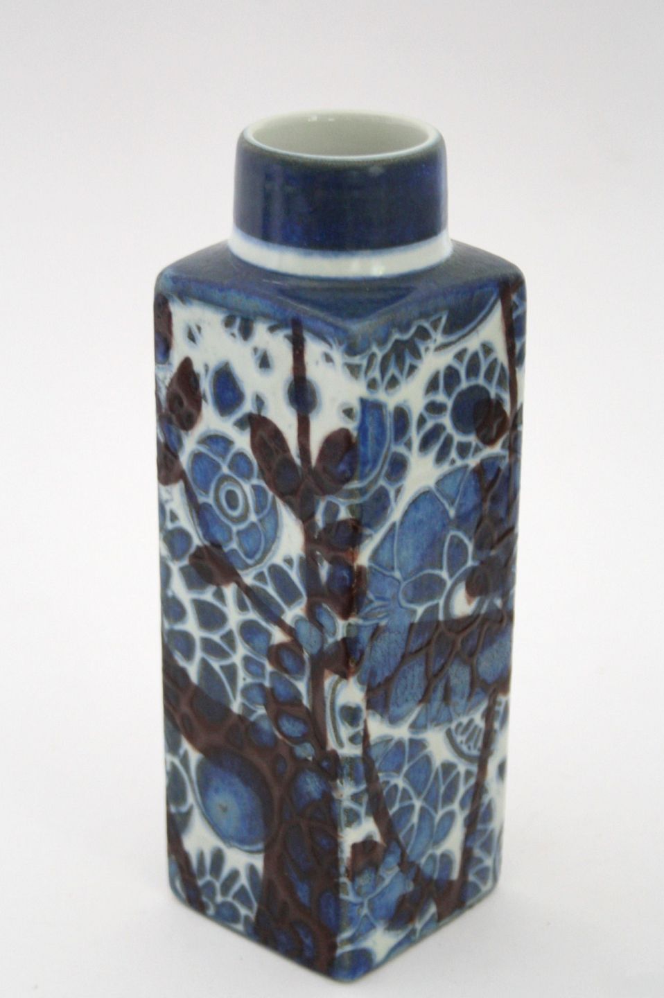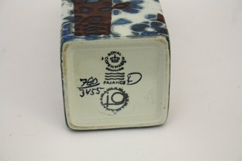 Royal Copenhagen, Blå Baca vase. Designet af Johanne Gerber. Dek.nr. 780/3455. Højde 19 cm. 6 x 6 cm. Øverste diameter 4 cm. Pris: SOLGT