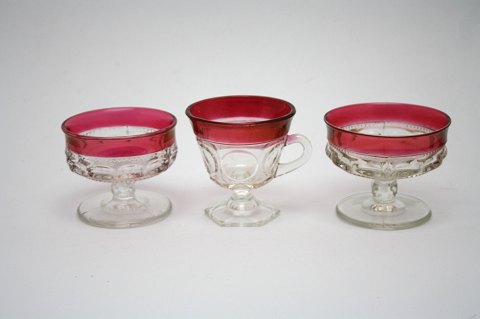 Amerikanske presset glas med rød lustrekant. Cocktailglas. Højde 7,5 cm. Diameter 9 cm. Pris: SOLGT Cocktailglas. Højde 8 cm. Diameter 9,5 cm. Pris: SOLGT Punchkop. Højde 9 cm. Diameter 8,5 cm. Pris: 100 kr. stk. Lager: 2