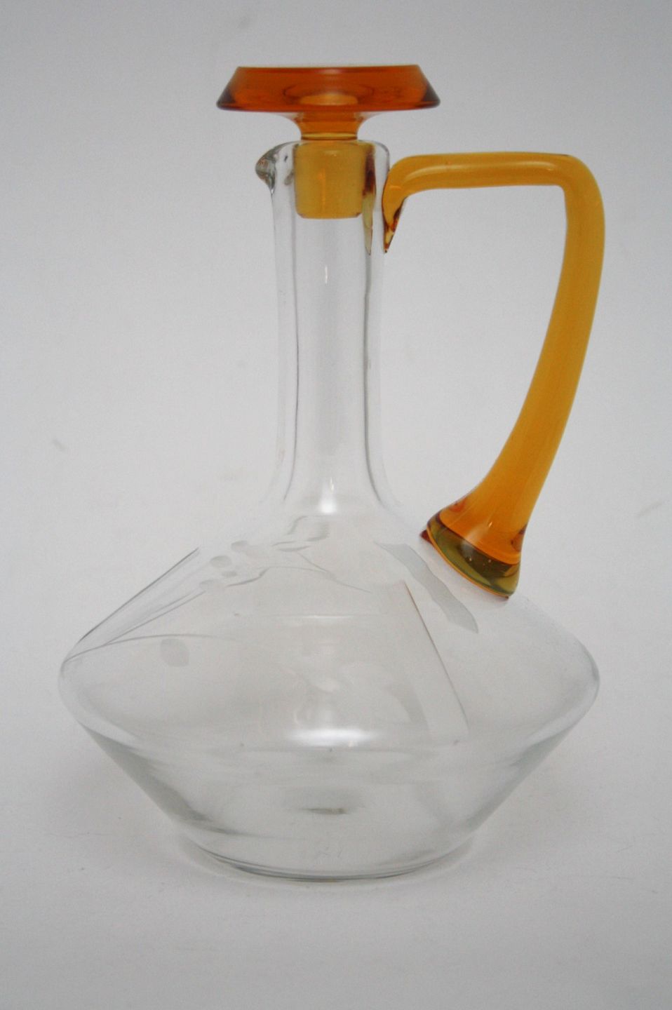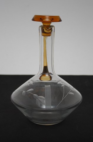 Likørkaraffel med ravfarvet prop og hank antagelig svensk.