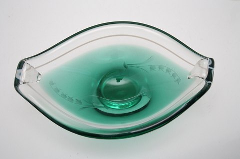 Orrefors, grøn aflang glasskål med ører. Indgraveret med liljekonvaller af glasgravør W.Johansson. Højde 11 cm. Længde 23,5 cm. Bredde 15 cm. Vægt 1280 g. Pris: 425 kr