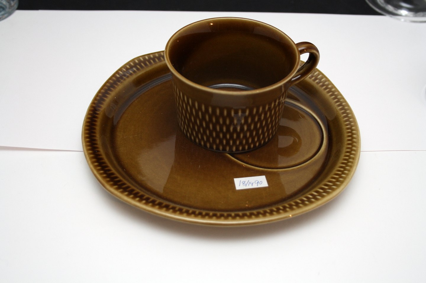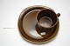 Brun kop med morgentallerken. Højde 6 cm. Tallerken diameter 20,5x20,5 cm. Pris: SOLGT