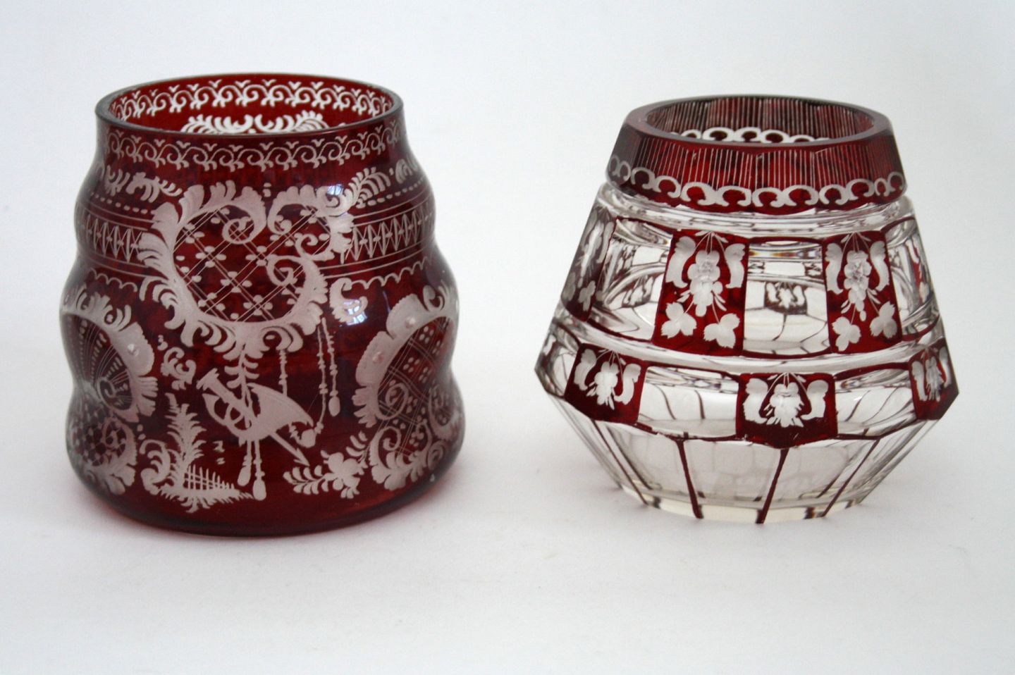 T.v. Krukke/vase med ornamenter. Højde 11 cm. Øverste diameter 8,3 cm. Ujævnheder i kant. Pris: 300 kr.