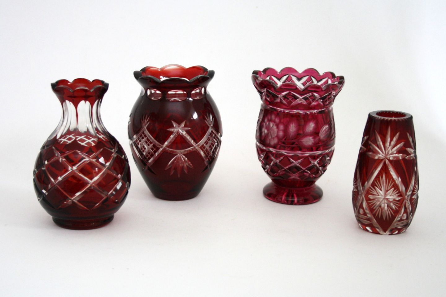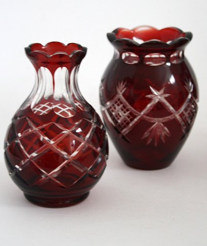 Røde Bøhmiske krystalvaser. Fra venstre mod højre.