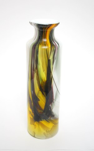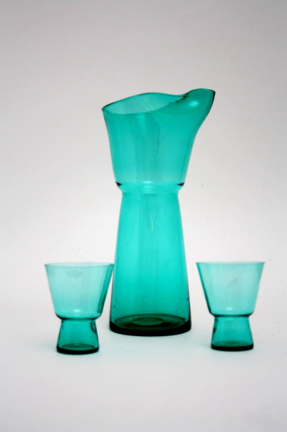 Kande med 2 dobbelt konisk drikkeglas fra grøn serie Kastrup glasværk 1960, designer Jacob Bang. Kanden har haft bambus bevikling. Kande, højde 25 cm. Drikkeglas, højde 7,9 cm. diameter 6,2 cm. Pris SOLGT