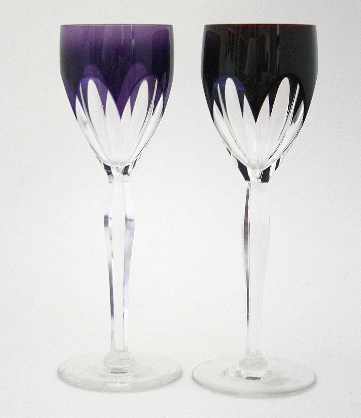 Bøhmisk krystal. Bordeaux og lilla. Højde 22 cm. Øverste diameter 7 cm. Pris: SOLGT