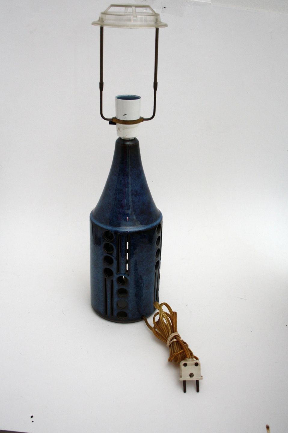 Michael Andersen, Blåglaseret lampe med huller designet af Marianne Starck. Form nr. 6287. Højde incl. fatning. 38 cm. Pris: SOLGT